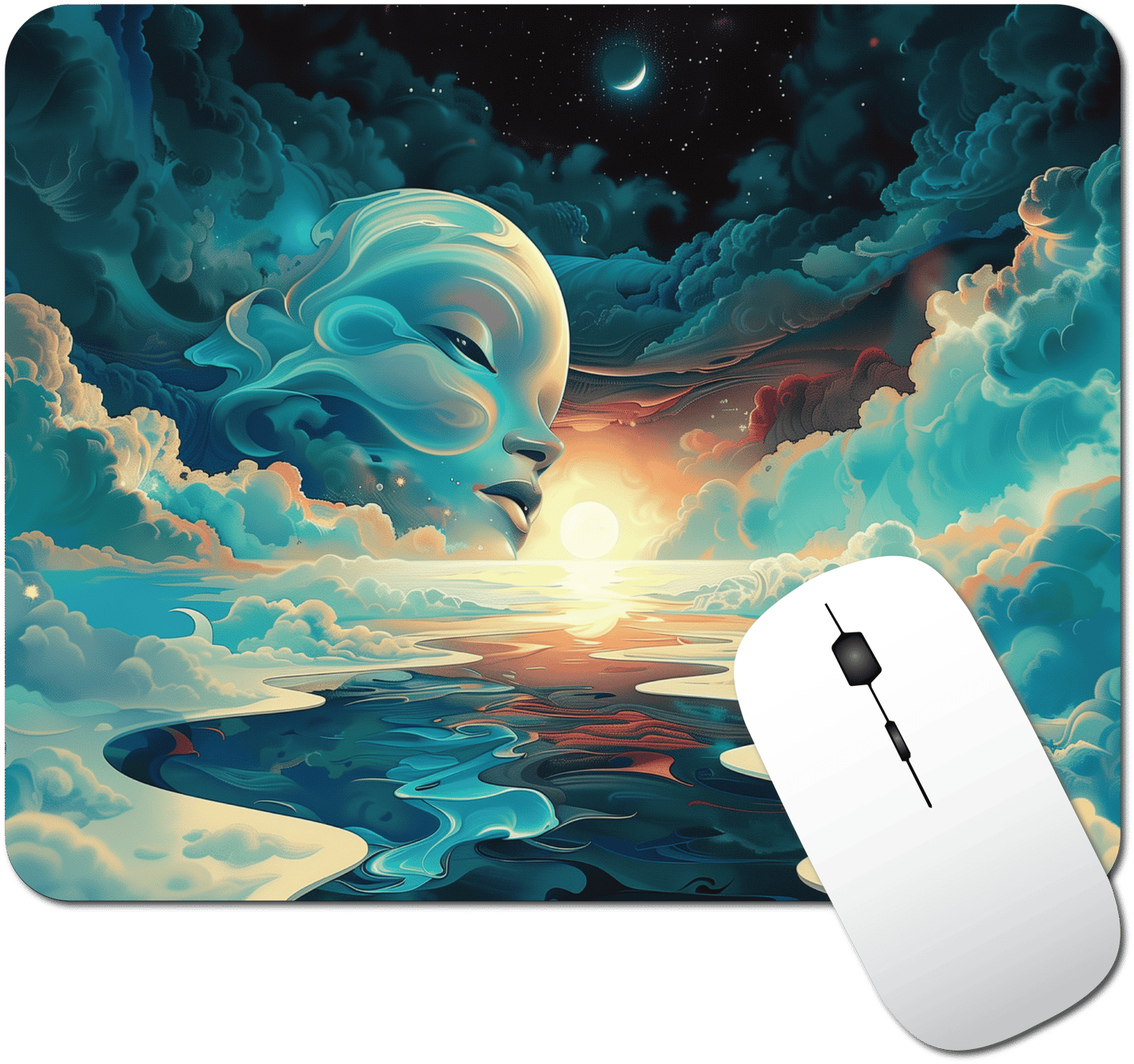 This stunning design showcases a mystical figure emerging from the clouds, contemplating a vast, starry sky. The artwork masterfully combines the serene beauty of a tranquil dawn with the awe-inspiring expanse of the cosmos. Infuse your desk with a touch of magic and inspiration, turning it into a sanctuary where imagination and reality seamlessly blend.