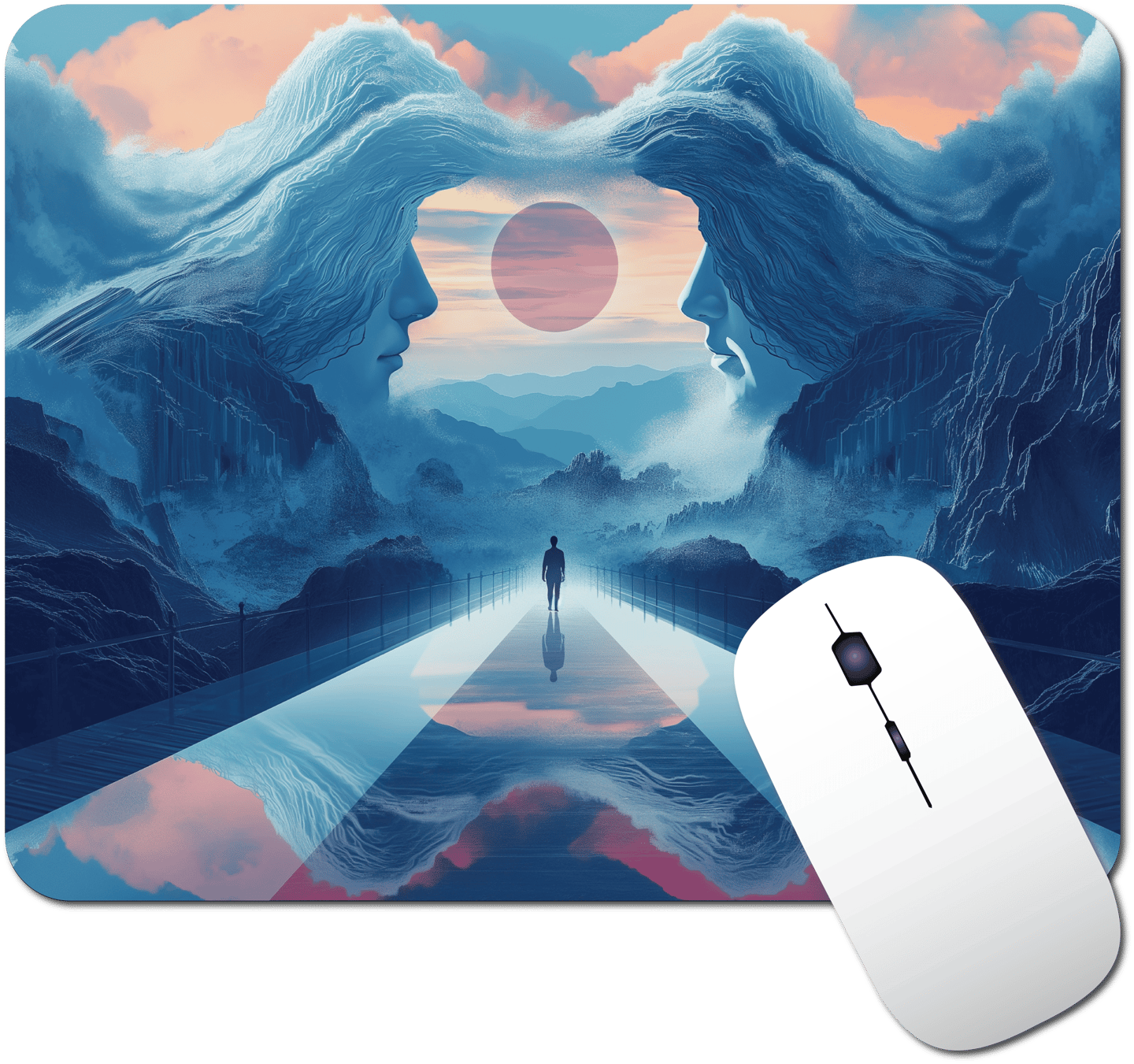 This mesmerizing design features a lone figure walking along a reflective pathway that stretches into a surreal landscape. Majestic mountains frame the scene, with their peaks transforming into serene faces gazing at each other, creating an archway in the sky. The fusion of tranquil faces and dramatic scenery evokes a sense of introspection and wonder, making your workspace a portal to a dreamlike world.